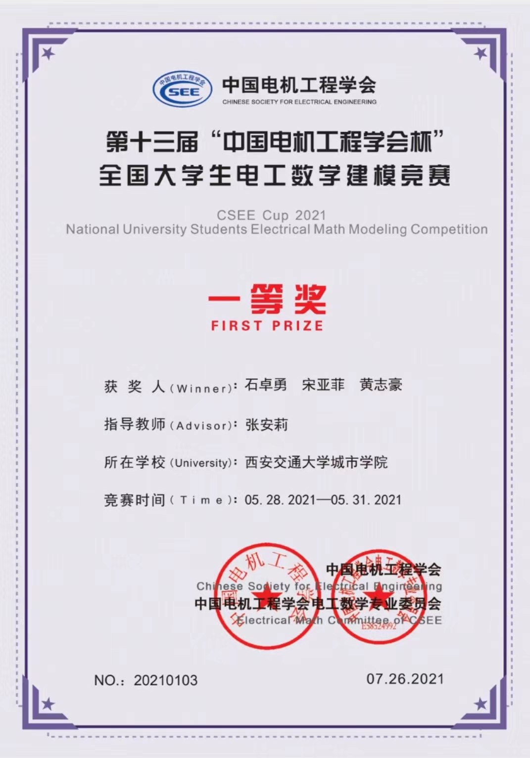 石卓勇和队友在“电工杯”全国大学生数学建模竞赛中取得一等奖