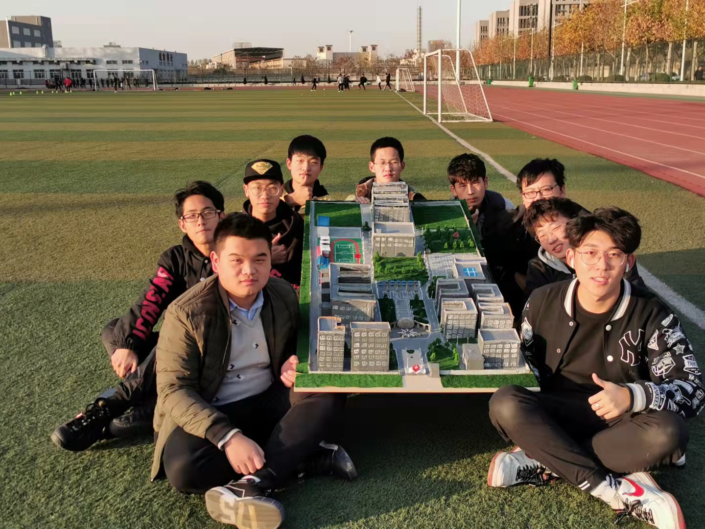 陆天晟和机械设计创新大赛团队成员及他们的二等奖作品《城市之光》,左排前二为陆天晟