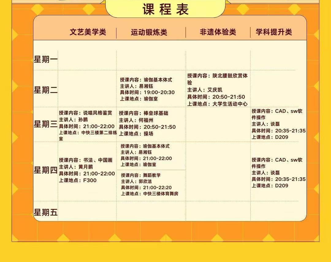 为适应城院青年新发展,营造良好的校园文化氛围,为城院青年赋能服务站,丰富青年发展新场景,学校团委联合学生社团开设"西交城院青年夜校",旨在拓展在校大学生的兴趣爱好、丰富课余文化生活品质,提升职业技能,打造一个学习之余相互交流、放松身心、提升自我、增加技能的多元化平台。