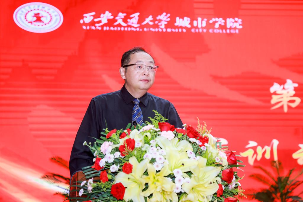 党委张爱萍书记作军训动员讲话。张爱萍书记代表学校对2024级新同学的到来表示热烈欢迎,对全体承训教官和参训干部表示衷心感谢。他指出,军训是大学生入校的“第一课”,它既是培养有理想、敢担当、能吃苦、肯奋斗的新时代青年的重要途径,也是青年大学生履行公民义务、承担社会责任的具体体现,更是青年大学生接受国防教育和集体主义教育的重要载体。他对本次军训工作提出四点希望和要求:一是希望全体参训学员振奋精神、刻苦训练、锤炼意志;二是希望全体承训教官科学施训、严格要求、以情带训;三是希望全体带队干部强化责任、恪尽职守、全身心投入;四是希望军训团牢固树立安全第一的思想,注重细节,确保军训工作安全有序进行。